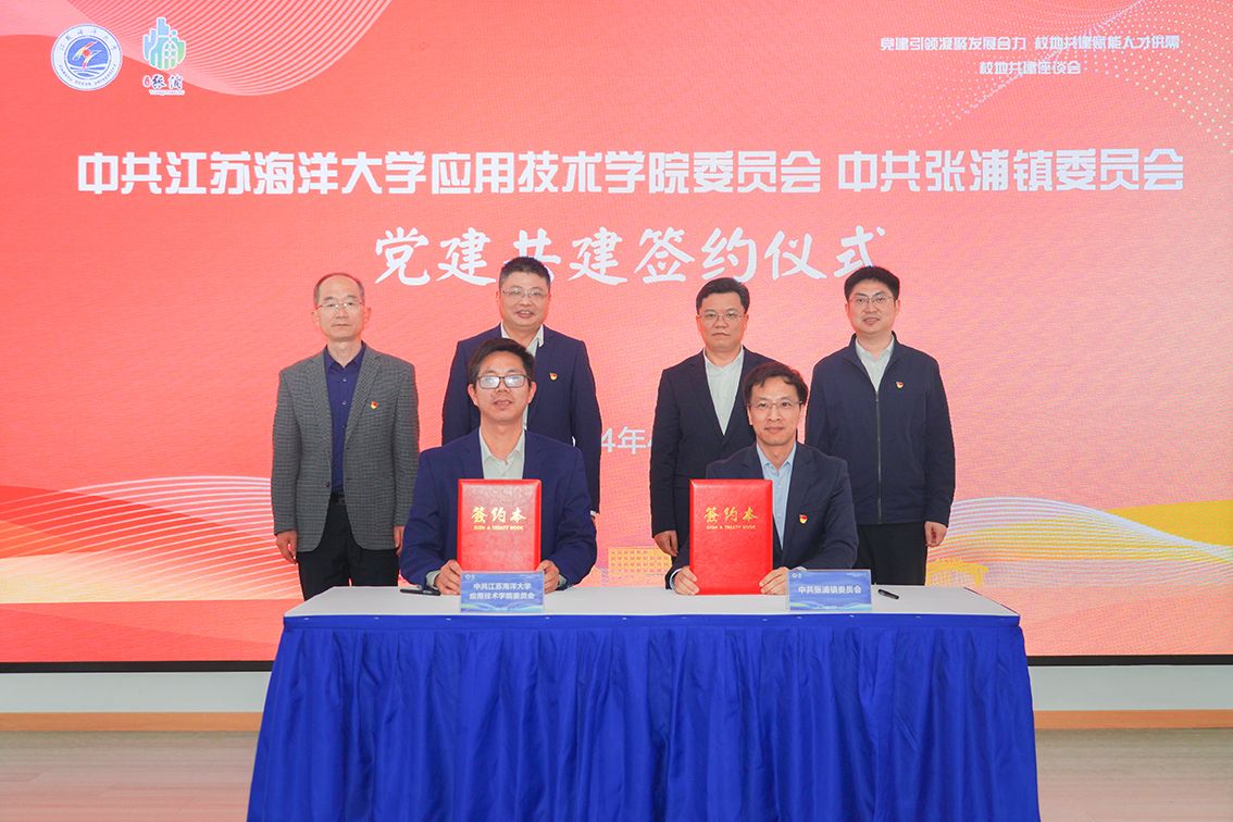 座谈会上中共江苏海洋大学应用技术学院委员会与中共张浦镇委员会签署了结对共建协议。校企双方代表还分别签署了校企合作协议、就业实习实践基地协议。