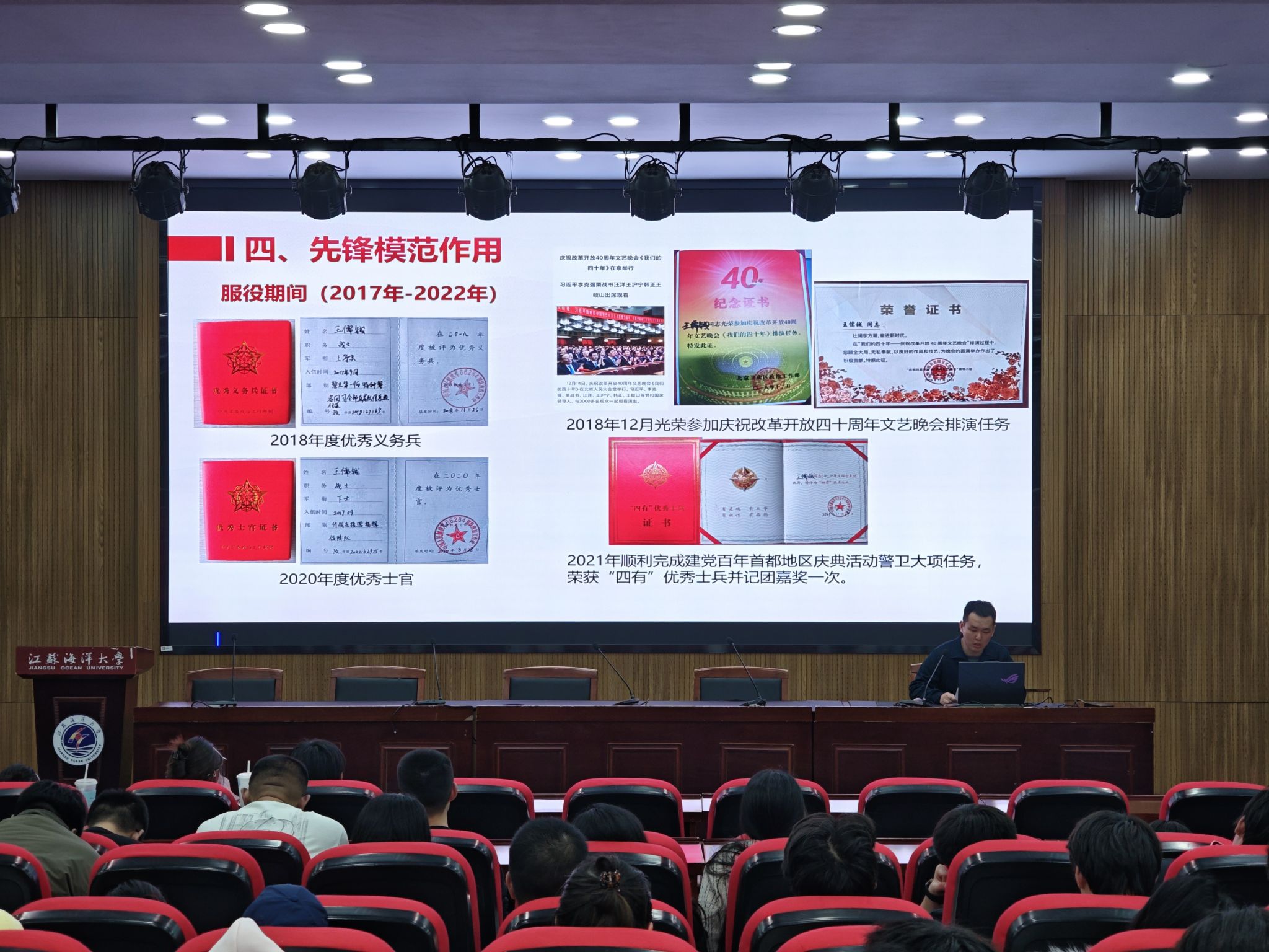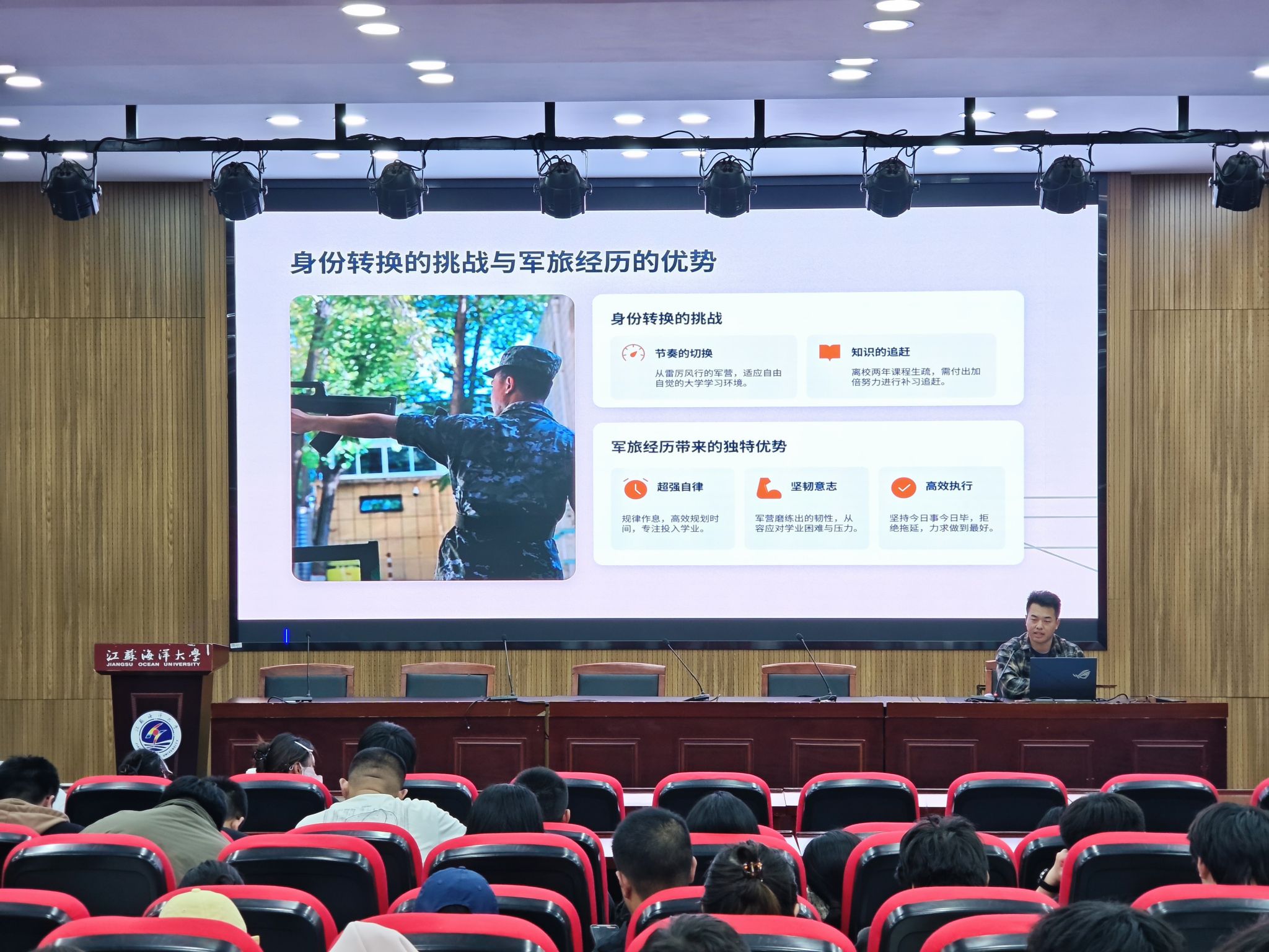退伍大学生计算机4251班韩红阳结合自身军营经历,分享了属于自己的青春奋斗故事与成长感悟。他深情回忆了自己参军的初心与抉择,讲述了军营生活中与战友并肩作战、互帮互助的日子。同时,他还分享了自己退伍复学后的学业规划,并寄语学弟学妹:“不必人人奔赴军营,但人人皆可心怀家国;不必个个身披戎装,但人人皆可不负韶华。立足校园,深耕学业、锤炼过硬本领,也可以以知识为刃、以担当为甲,用所学所长服务社会、报效国家,书写属于新时代青年的责任与荣光。”