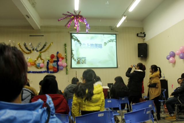 晚会开场,大四学长林祎同学带来了激情四射的演唱B-BOX,引起现场阵阵的掌声、笑声和欢呼。 接着,进行了水果拼盘比赛,每组两人,共有四组,她们用苹果、香蕉、桔子、柚子等水果,现场制作水果拼盘。结果海州书院的王惠之、徐啸筱组合向日葵造型的水果拼盘作品获胜夺冠,凌州书院彭晓婷、李欣宇同学组合、海州书院夏心培、张家豪组合、海州书院达姝洁、伏晓组合分获二、三、四名。最终是激动人心的压轴戏 “90秒吃汉堡大作战”,大家使出最本能的“吃货”解数,紧急动员全身神经,抛去平时“大小姐”、“小先生”的温文尔雅,紧吃、快嚼、快咽,巴不得一口吞天,结果海州03班王惠之同学赢得了“吃货大王”的称号、海州08班田慧阳同学、凌州书院姜晓馨同学、史雅芝同学分获吃货大赛二、三、四名。活动中同学们还不时收到了“圣诞老人”赠送的各种精美小礼物、七彩糖果及其他小食品。