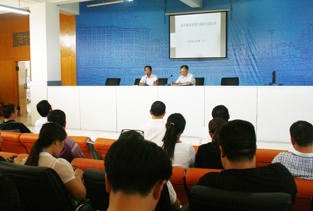 8月29日下午,我院在学生学业导航中心会议室召开新学期工作部署会,传达校中层干部会议精神,部署新学期重点工作。院党委书记周清华主持会议,院长樊华作“转型发展与我们当前任务”的工作报告,学院全体教职工参加会议。