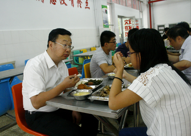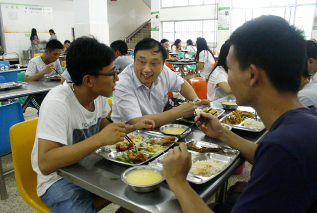 在松林餐厅,校领导在窗口排队买饭,坐到学生中间,边吃饭边与同学们亲切交谈,询问同学们学习、生活等情况,听取学生对食堂管理和后勤服务等方面工作的意见与建议。