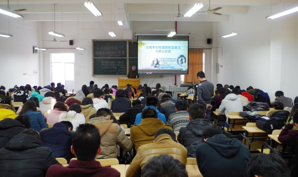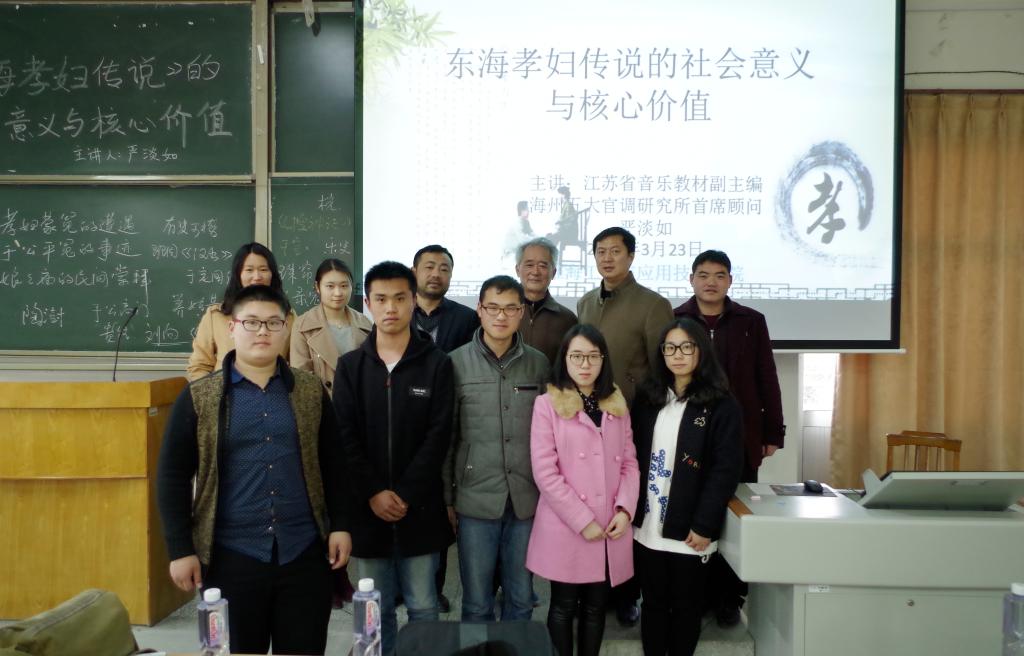 3月23日下午,我院在敦行楼115教室举办“与信仰对话”报告会,邀请江苏省音乐教材副主编、市非遗保护专家委员会成员、海州五大宫调研究所首席顾问严淡如教授作“东海孝妇传说的社会意义与核心价值”主题讲座。院党委副书记、副院长万金店及160余名师生亲临现场品味经典、对话信仰。