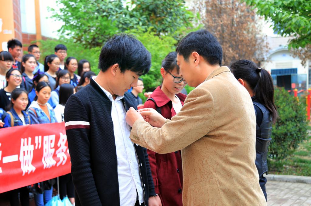 启动仪式上,万金店同志与王惠同志分别为学生党员佩戴党徽,并发表讲话。万金店以“同志”的称呼告诫在场的全体党员要始终牢记党员身份,从“学党章党规、学系列讲话”入手,通过学习教育加强党性修养、增强党员意识。他强调,“做合格党员”要处处体现党员作风,做到讲政治、有信念,讲规矩、有纪律,讲道德、有品行,讲奉献、有作为。希望广大学生党员以本次活动开展为契机,通过不间断的志愿服务,关注群众、关注民生、关注弱势、关注环境,参与社区文化、生态文明建设、科普文化传播,由对己负责递进到对他人、对社会、对国家、对民族负责,不断增强社会责任感。