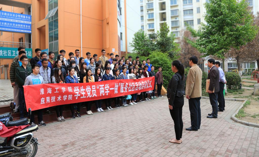 4月20日下午,我院“学生党员 ‘两学一做’、服务社区”活动启动仪式在花果山街道宋跳社区隆重举行。院党委副书记、副院长万金店、宋跳社区党支部书记王惠、院学工办主任、学生第一党支部书记张明祖、学生第二党支部书记孙成广及全体2013级学生党员参加了仪式。