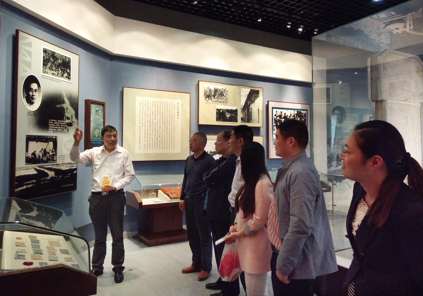 在全国爱国主义教育示范基地、全国百家红色旅游经典景区新四军纪念馆,党员们先后瞻仰了东进铜雕、抗战纪念碑并重温了入党誓词。步入展厅后,学工办主任、学生第一党支部书记张明祖副教授以其盐城人的瓢城记忆及多年的《中国近代史纲要》讲授经验主动担当起了讲解员。他结合馆藏文物史料、图片雕塑、多媒体影像等生动详实地讲解了新四军“组建铁军 开赴敌后”、“重建军部 挺进华中”、“驰骋江淮 浴血奋战”、“战略反攻 夺取胜利”的恢弘篇章。“听党指挥,忠于人民,坚贞不渝的铁的信念;不怕牺牲,敢于胜利,百折不挠的铁的意志;军民一致,官兵一致,牢不可破的铁的团结;令行禁止,执纪严明,秋毫无犯的铁的纪律;勇猛顽强,英勇善战,所向无敌的铁的作风”的铁军精神在讲解中被一遍又一遍的提起。