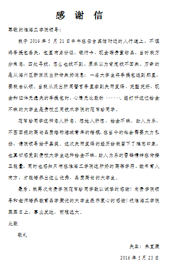 5月26日学校收到了家住外地的失主朱宜康三天前写好的感谢信,信中表达了对我校及来自我院Z财务131班的范常珍同学的诚挚谢意。