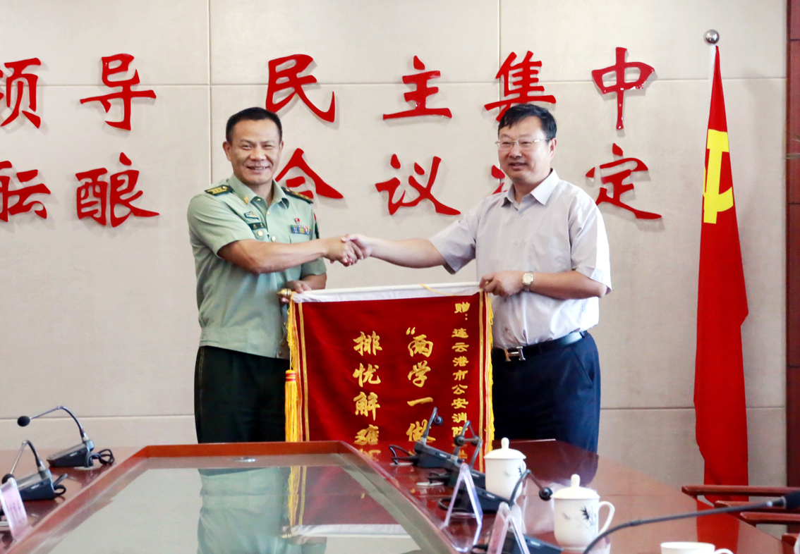 在赠旗仪式上,宁晓明介绍了学校的发展现状、发展目标和发展战略,重点介绍了学校创建江苏海洋大学的基本情况,并希望与市消防支队进一步加强交流与合作,开展更多有益的活动。特别是在教职工文艺、体育、新生军训及大学生消防志愿服务方面与市消防大队建立更紧密的警学共建关系。