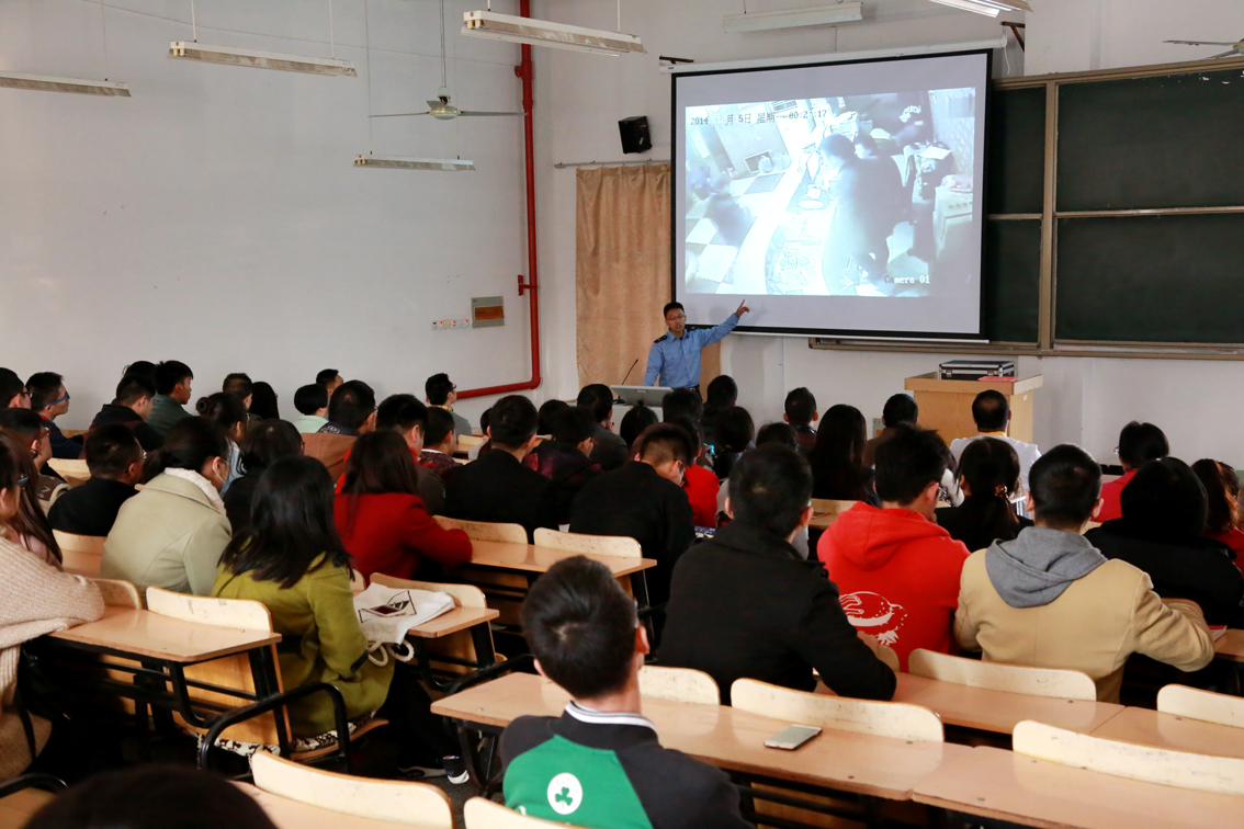 赵教员通过大量的消防案例,从一张张触目惊心的照片、视频和数字,剖析了火灾的严重危害。通过案例分析,查找火灾危害的主要因素:有毒烟雾、无边黑暗、高温炙烤、错误逃生等。重点讲述了燃气、电器使用安全常识及爆炸发生原因分析,公共场所防火、家庭防火及车辆防火知识。现场演示发生火灾如何正确逃生,各类消防器材的正确使用及日常保养。最后发出了消防及逃生器材进入全民的生活、工作、家庭的倡导。讲座现场,同学们积极参与互动,争先上台演示消防器材的使用。
