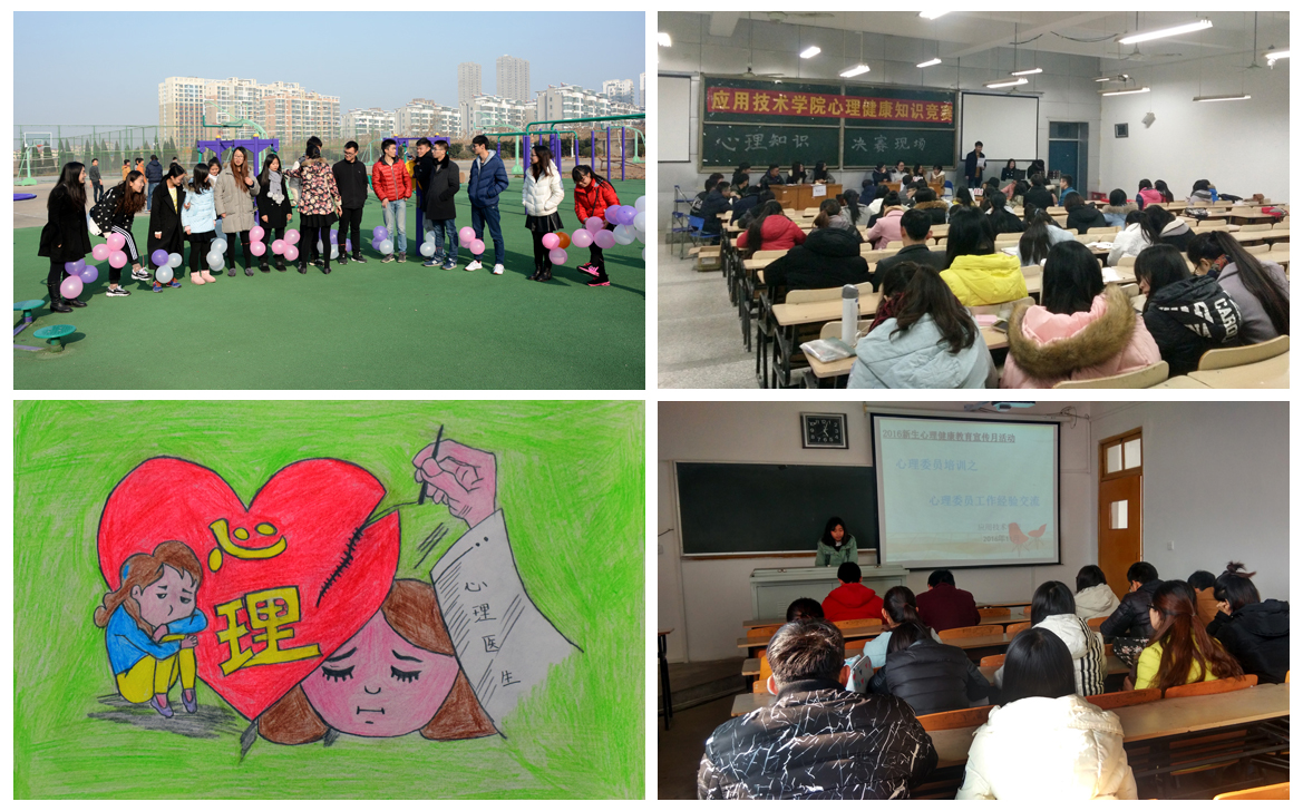 为了增强教育宣传效果,学院先后开展了主题班会、专题讲座、素质拓展、趣味运动会、心理委员培训、新老心理委员经验交流、心理普查、心理知识名生讲坛、心理知识竞赛、心理漫画评比、心语心愿征集等系列活动,在延续传统、扎实推进的同时注重创新、增强活力。