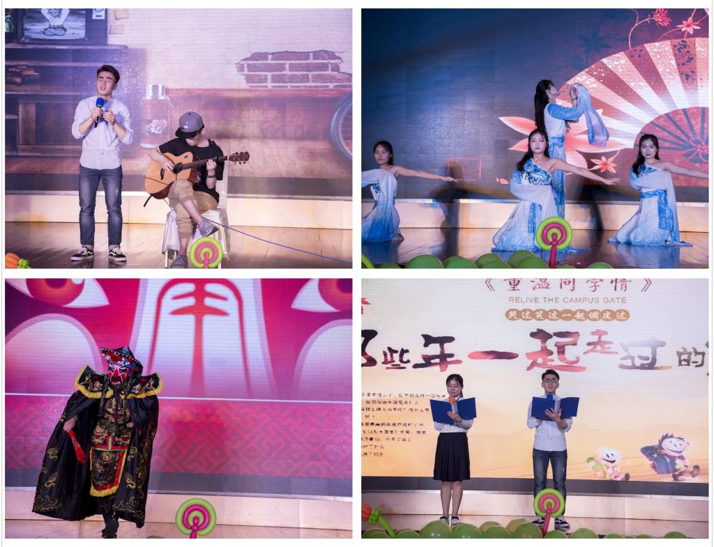 随后,领导和93级校友们欣赏了由我院学生带来的精彩文艺演出。扇子独舞《苏堤春晓》的优美舞姿让观众仿佛身临苏堤的美景;吉他弹唱《成都》勾起了校友在连云港这座城市的青葱回忆;古典舞《卷珠帘》带动观众在玉环光转中聆听时光的声音;国粹《川剧变脸》则让观众感受了中国传统文化的博大精深;朗诵《同学颂》让校友重温或笑或泪、至今不忘的共同画面。此外,宴会期间穿插了神奇魔术、可爱小丑、校友唱歌等互动环节,一次次将晚会气氛推向高潮现场,现场掌声不绝。