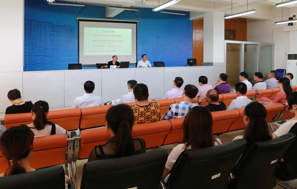为使全院党员进一步明确推进“两学一做”常态化制度化的动因,明确学习教育目的,深化主动学习意识,学院党委邀请马克思主义学院袁贵礼教授做“全面从严治党”专题辅导报告。学院全体教职工党员、部分学生党员现场聆听了报告。袁教授从习近平总书记全面从严治党思想的形成、中国共产党特殊境遇与全面从严治党、苏共失败的镜鉴:必须全面从严治党、治国必先治党,治党务必从严四个方面对全面从严治党进行了生动详实的讲解。他认为,办好中国的事情,关键在党。当今中国的事情千头万绪,概括起来就是两个方面——党领导的中国特色社会主义“伟大事业”和党自身建设的“伟大工程”。他通过深入剖析没有政党竞争环境中全面从严治党的理论支撑、全面从严治党的内在动力、全面从严治党的监督力量、全面从严治党的关键点及难点,使大家真正明白党员合格,党才有力量,党有力量,中国才有希望。