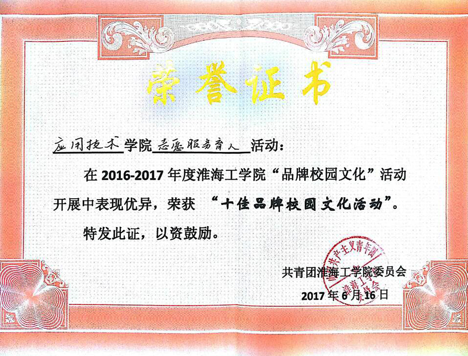 近日,从校团委传来好消息,由我院申报的“志愿服务育人”项目荣获淮海工学院“十佳品牌校园文化”项目称号。