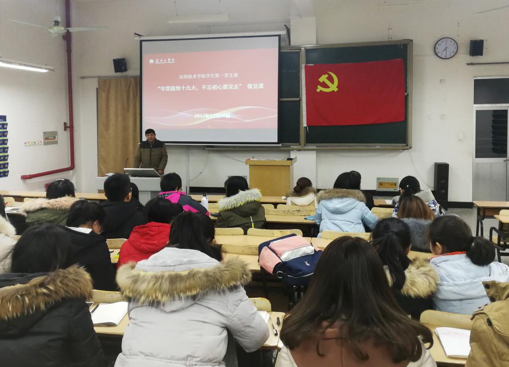 为深入学习十九大报告精神和习近平新时代中国特色社会主义思想,全面提升党支部党建工作活力,推动师生党员坚定信仰、奋发有为、勇于担当,我院学生第一党支部于12月19日晚,举办“学思践悟十九大,不忘初心跟党走”微党课学习活动。