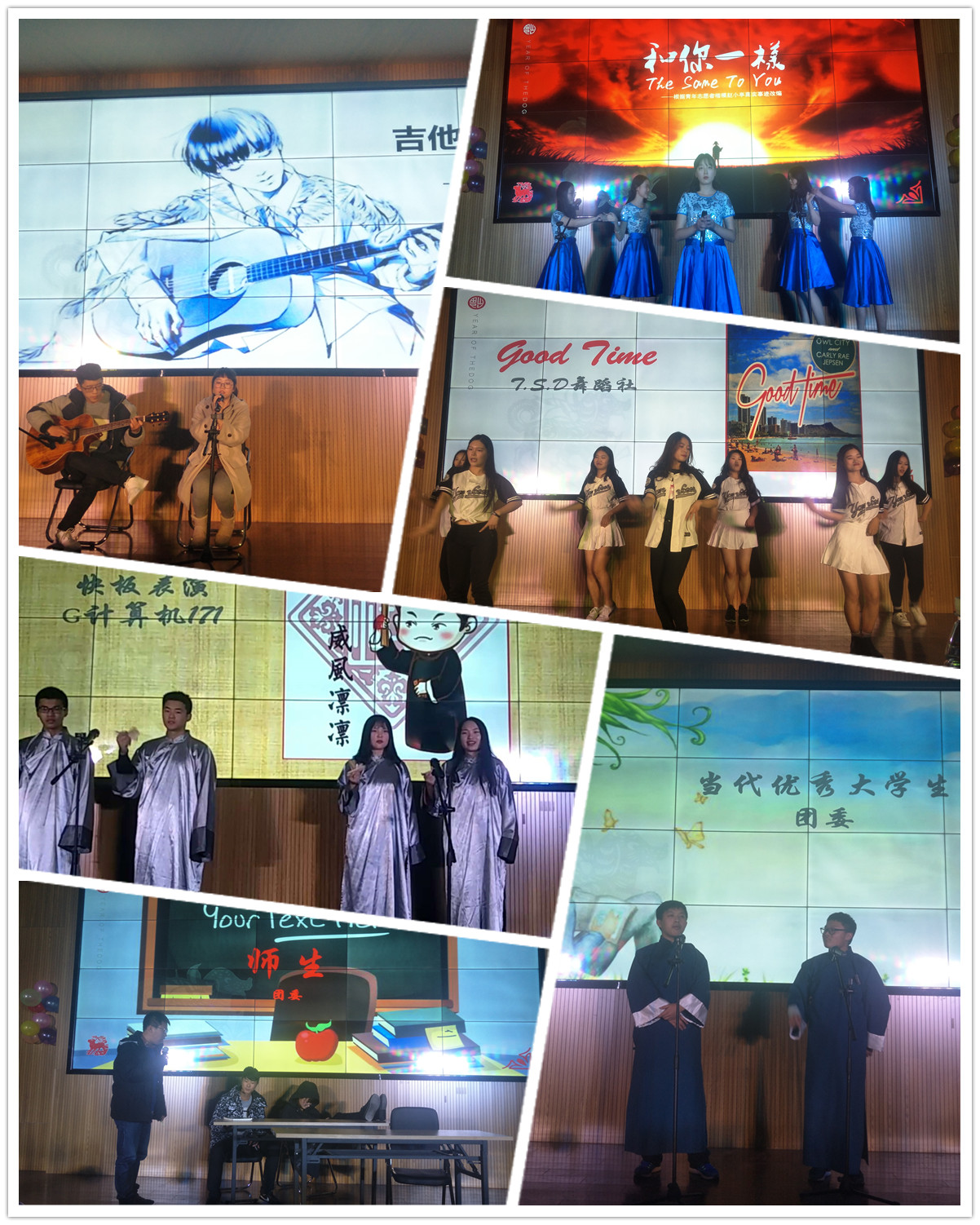 晚会在热闹喜庆的开场舞《好运来》中拉开帷幕,舞蹈青春活力,舞出了我院的蓬勃朝气。吉他弹唱《奇妙能力歌》简单的曲调,清新的歌词,伴随着吉他的拨弄,似诗非诗,让听众把自己的经历和感情融入进这首歌中,迅速产生共鸣。话剧《留下一片爱》表达了拒绝歧视和冷漠,用爱防“艾”的人间大爱。舞蹈《good time》充分展示了青年人的朝气与活力。快板表演《纵情高歌十九大》,通过快板演绎,把十九大讲给同学们听,诠释青春与梦想,共颂十九大赞歌。相声《当代优秀大学生》通过诙谐幽默的形式反应大学生活,让同学们笑过之后带来思考。歌曲串烧唱出了新年新气象。风趣的小品《师生》,声情并茂的表演瞬间点燃全场热情。最后在小合唱中国红十字基金会公益宣传歌曲《和你一样》中圆满落下帷幕,感动全场。