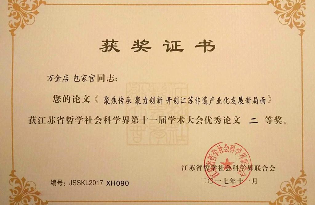 1月9日,由中共江苏省委宣传部、江苏省哲学社会科学界联合会共同主办的省社科界第十一届学术大会学会专场在南京召开,会议从参评的450余篇论文中评选表彰优秀论文一等奖31篇、二等奖58篇。我院党委副书记、副院长万金店等人在本学院弘扬优秀传统文化、非遗传承保护长期实践基础上撰写的研究成果论文《聚焦传承 聚力创新开创江苏非遗产业化发展新局面》荣获二等奖。