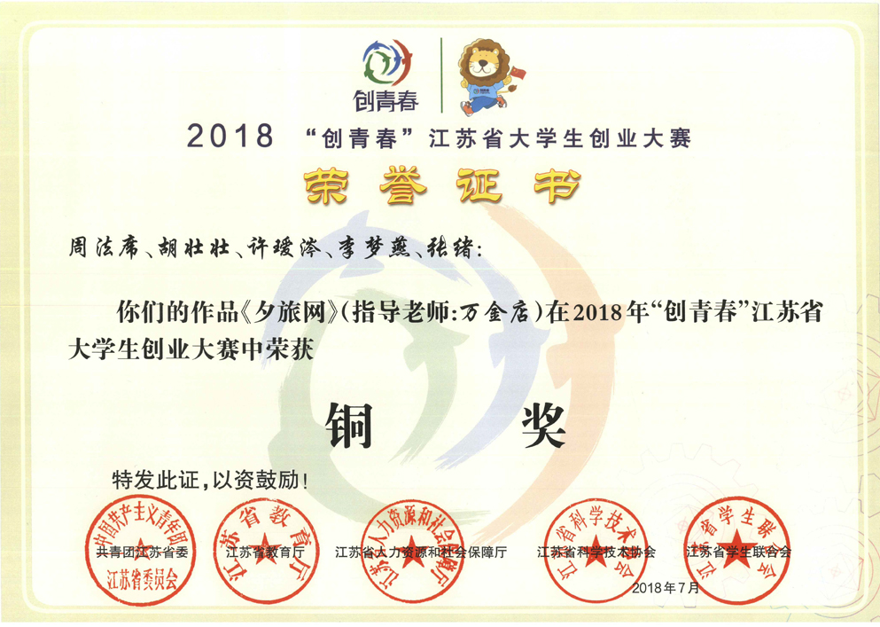 近日,由共青团江苏省委、江苏省教育厅、江苏省人力资源和社会保障厅、江苏省科学技术协会、江苏省学生联合会主办的“创青春”江苏省大学生创业大赛公布最终结果,我院参赛作品《夕旅网》(作者:Z机械141周法席、Z软件151胡壮壮、G营销171许瑷涔、Z软件152李梦燕、G机械172张绪;指导老师:万金店)荣获铜奖。这也是我院近年来在学生创新创业项目中的一个新突破。