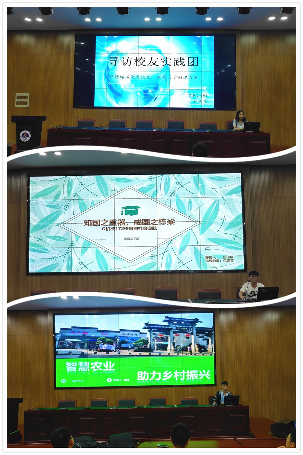 分享交流会在实践团队的PPT和视频展示中拉开帷幕。市级重点团队“文化港城行,追溯西游梦”暑期社会实践团走上讲台,讲述他们走遍港城访西游名家、寻西游遗迹、弘西游文化,追溯西游梦,助力港城西游文化名城构建。市级博爱青春项目“博爱青春·生命永动——无偿献血下乡宣传社会实践团”,以调查问卷、访谈的形式调研社会群众对无偿献血的认知程度,比较城乡居民对无偿献血的认同情况,并通过文艺演出、骑行宣传、快闪表演探索农村地区无偿献血宣传的新模式。市级博爱青春项目“关爱学龄前智力落后儿童·相约共成长”社会实践团,我院学子辅助开展学龄前轻度智力落后儿童社会融入训练、进行早期矫正,并通过3D打印辅助支具以科技助推公益。“智慧农业,助力乡村振兴”团队在社会实践的基础上,深入了解农村风貌,详细的讲解了当前农业企业发展的市场前景、农业企业的用人理念、企业发展的人才需求。“感悟淮盐遗蕴,挖掘文化精髓”社会实践团,溯源淮盐之美,品味淮盐遗蕴,并向同学们介绍了淮盐的悠久历史和淮盐的制作工艺。“守望诚信·点亮港城”社会实践团以践行社会主义核心价值观“诚信”为内核,关注港城信用建设传递正能量,树立新风尚。“寻访港城优秀校友,凝聚大学创建力量”深入挖掘校友这一学校发展的重要力量与重要资源,为学校建设发展建言献策,整理、撰写、编辑50份优秀校友访谈记录(包括基本信息、工作业绩、求学回顾、母校寄语等),形成约50000字的《淮海工学院连云港校友访谈录》。