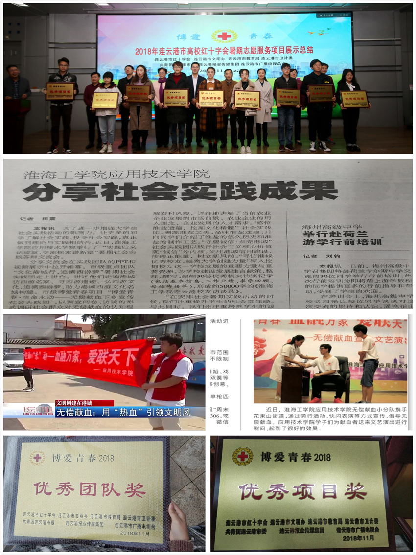 日前,连云港市红十字会、市文明办、市教育局、市卫计委、共青团连云港市委、连云港报业传媒集团、连云港市广播电视总台七家单位联合举办的全市高校红十字会“博爱青春”暑期志愿服务项目展示交流会顺利举办。我院“无偿献血下乡宣传”暑期社会实践团、“关爱学龄前智力落后儿童”暑期社会实践团,汇报了我院暑期志愿服务的实施情况和取得的成果,并荣获2018年连云港市暑期社会实践优秀项目奖、优秀团队奖。