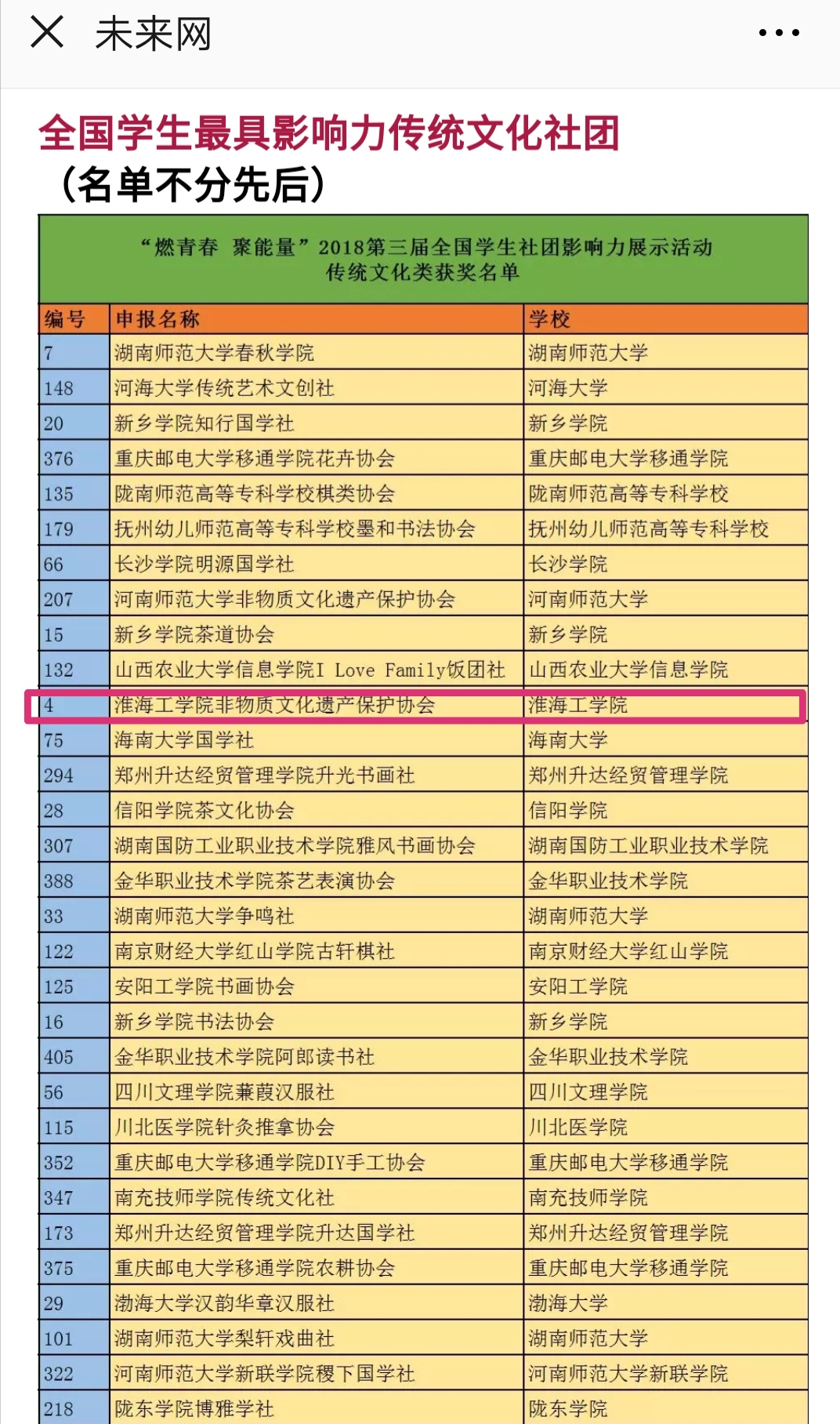 近日,由共青团中央网络影视中心、未来网主办的“燃青春聚能量”2018年第三届全国学生社团影响力展示活动公布获奖名单,我院非遗协会荣获“全国学生最具影响力传统文化社团”称号。