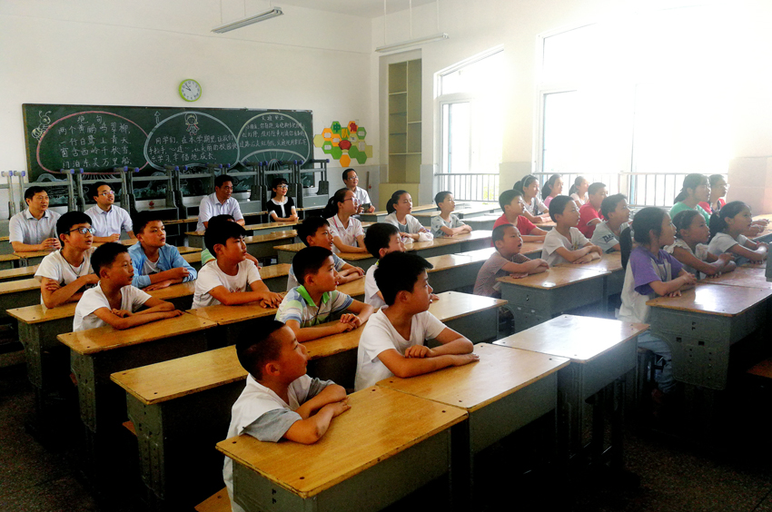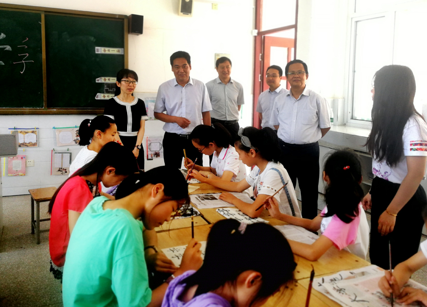 金芙蓉一行在塔山中心小学校长林杰的陪同下步入支教课堂与童梦剧场认真观看、聆听了支教团同学们的现场书法、京剧教学与太极拳、手语歌排练,并与同学们和农村留守儿童进行了亲切交流。金芙蓉详细了解了同学们的日常教学与食宿状况,充分肯定大家取得成绩的同时勉励在社会实践中多学习、多锻炼、多成长。在得知支教团成员有一半是党员,并在进行乡村国学课堂、艺术点亮童心、非遗夏令营三个板块基本教学的基础上通过王继才夫妇守岛事迹介绍与《海魂》读书会、“我的理想”交流会等形式对留守儿童们爱国主义教育与理想信念教育时,金芙蓉竖起了大拇指,并教导大家时刻不忘初心、牢记使命。