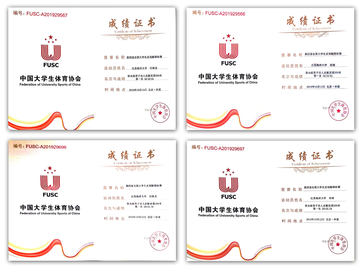 作为校皮划艇运动员,肖瑞与付琪龙两名同学自2018年9月入校以来多次代表学校参加各项皮划艇国家级大学生及无限制组别比赛,取得2018中国皮划艇公开赛男子双人休闲艇600米直道竞速赛第四名、第三届全国大学生皮划艇锦标赛男子双人皮艇直道500米第四名与200米第七名、2019第三届中国皮划艇公开赛男子双人休闲艇500米直道竞速赛第三名与男子单人海洋舟500米直道竞速赛第五名等一系列优异成绩。