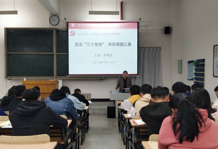 10月30日晚,学生社团党支部在敦行楼115举办“不忘初心、牢记使命”主题教育专题党课。副院长李明金同志以《坚定“三个坚持”夯实强国之基》为题为支部党员上党课。