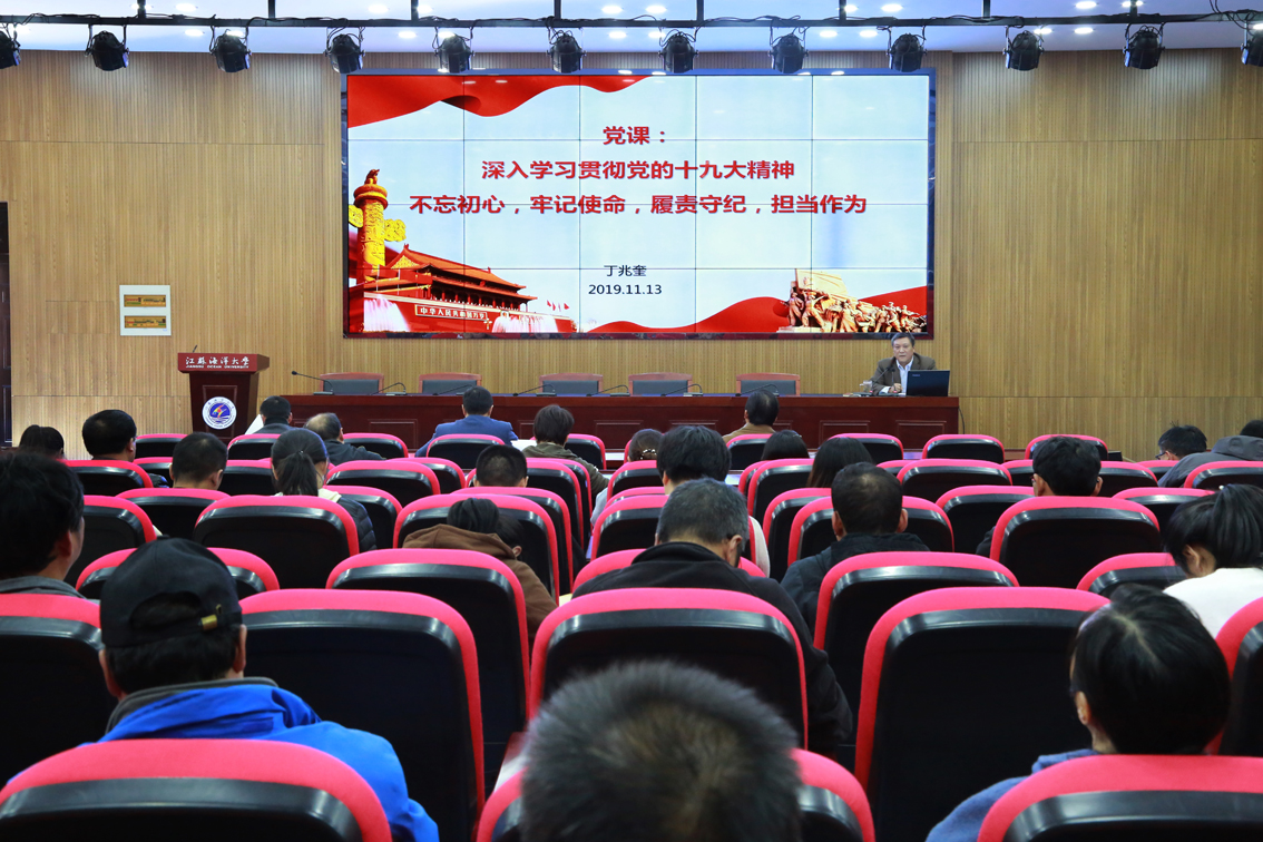 为持续推进“不忘初心、牢记使命”主题教育,11月13日,学院在敦行楼报告厅举办专题党课,院长丁兆奎结合学院工作实际,以“深入学习贯彻党的十九大精神,不忘初心、牢记使命、履责守纪、担当作为”为题,为全体教职工上了一堂生动的党课。