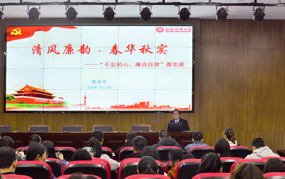 为巩固“不忘初心、牢记使命”主题教育成果,进一步推进我院师生廉洁教育和校园廉政文化建设,涵养风清气正、崇廉尚实的校园文化氛围,11月14日下午,院党委书记周清华在敦行楼报告厅面向师生党员和学生干部举办了“不忘初心,廉洁自律”清廉微党课,以廉政教育新模式传递廉政知识,使党风廉政教育从“文件”走向“文化”,使学生从“被动”走向“参与”,勉励师生党员和学生干部“初心守廉”。
