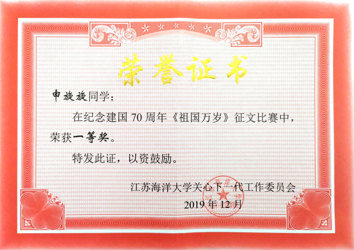 近日,由江苏省教育系统关心下一代工作委员会与江苏海洋大学关心下一代工作委员会分别以“庆祝新中国成立70周年”为中心开展的“祖国万岁”主题征文活动公布获奖结果。