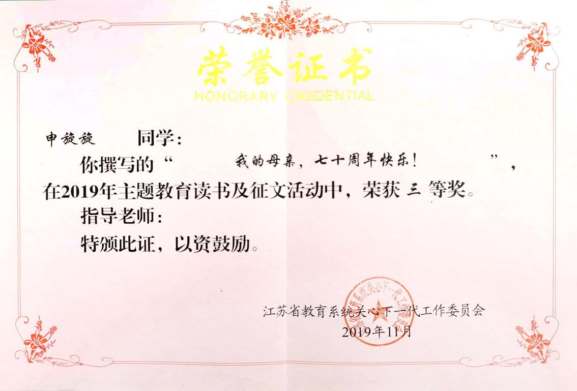 由我院关工委推荐的G机械182班申旋旋同学的作品《我的母亲,七十周年快乐!》荣获省三等奖、校一等奖,成为全校仅有的两个获得省三等奖的作品之一。Z中文151班徐华珍同学作品《圆我一个“绿色”梦》获得校三等奖。