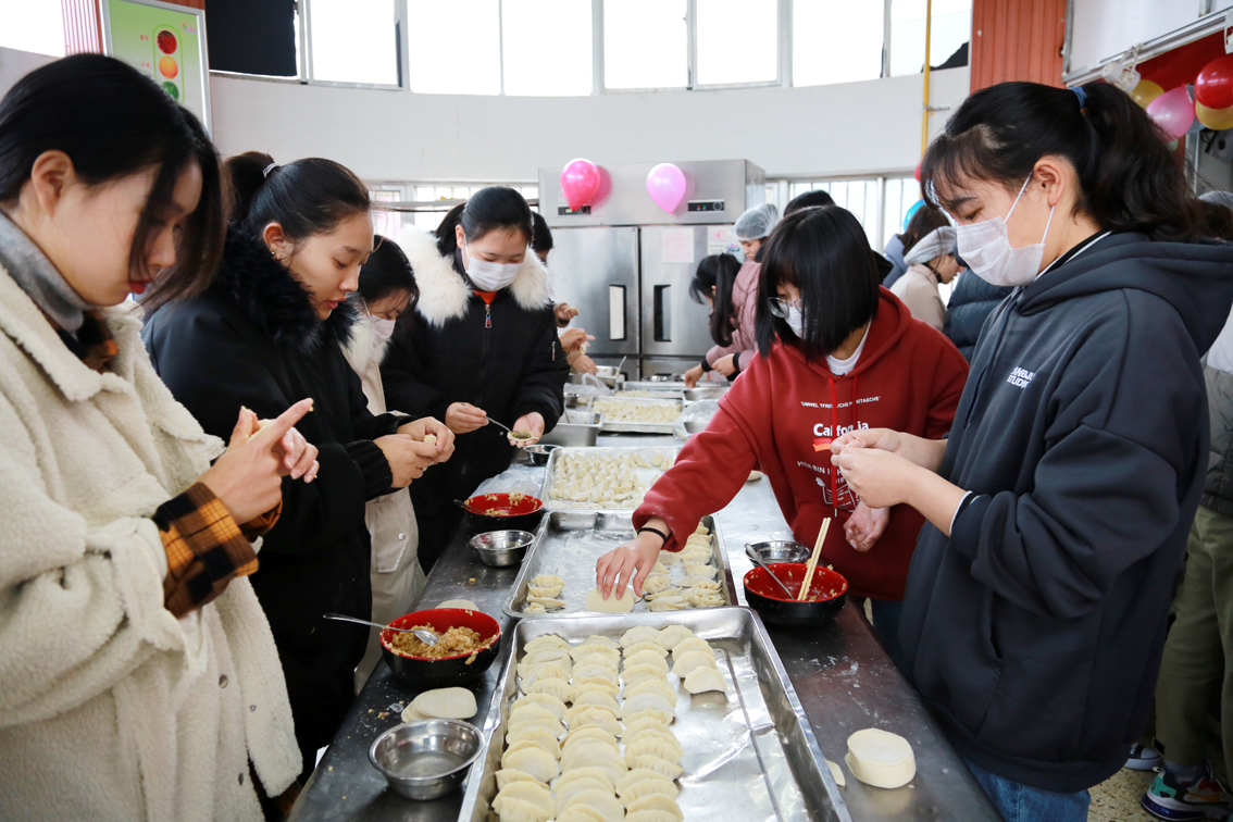下午3点,活动在学生餐厅准时开始,食堂的工作人员为师生们准备好饺子皮,调好了饺子馅,学院的师生员工一起包饺子,丁兆奎亲临现场,亲自给同学们演示如何包饺子,李明金也现场展示了多种饺子包法,同学们热情高涨,一个个饺子摆满了桌子,有花边的、有元宝的、有四角的、有麦穗的,形状各异。渐渐的同学们都掌握了包饺子的技巧,还开始了包饺子比赛,老师和同学们有说有笑,场面十分温馨和谐,到处洋溢着“家”的味道、“家”的温暖。