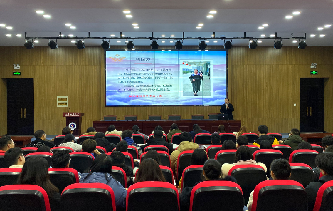 奋斗所到处,青春恰自来。为了加强青马班学员的思想引领,为学员们树立可爱、可亲、可敬、可学的青年榜样,激励广大学员努力学习,奋发有为。近日,荣获连云港市首届“我们身边的好青年”、“孝老爱亲好青年”荣誉称号的曾凤娇同学为我院青马学员做分享,讲述她的青春故事。