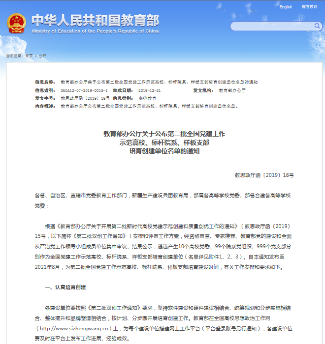 近日,教育部办公厅公布第二批全国党建工作示范高校、标杆院系、样板支部培育创建单位名单,我院学生社团党支部名列其中,成为第二批 “全国党建工作样板支部”培育创建单位。