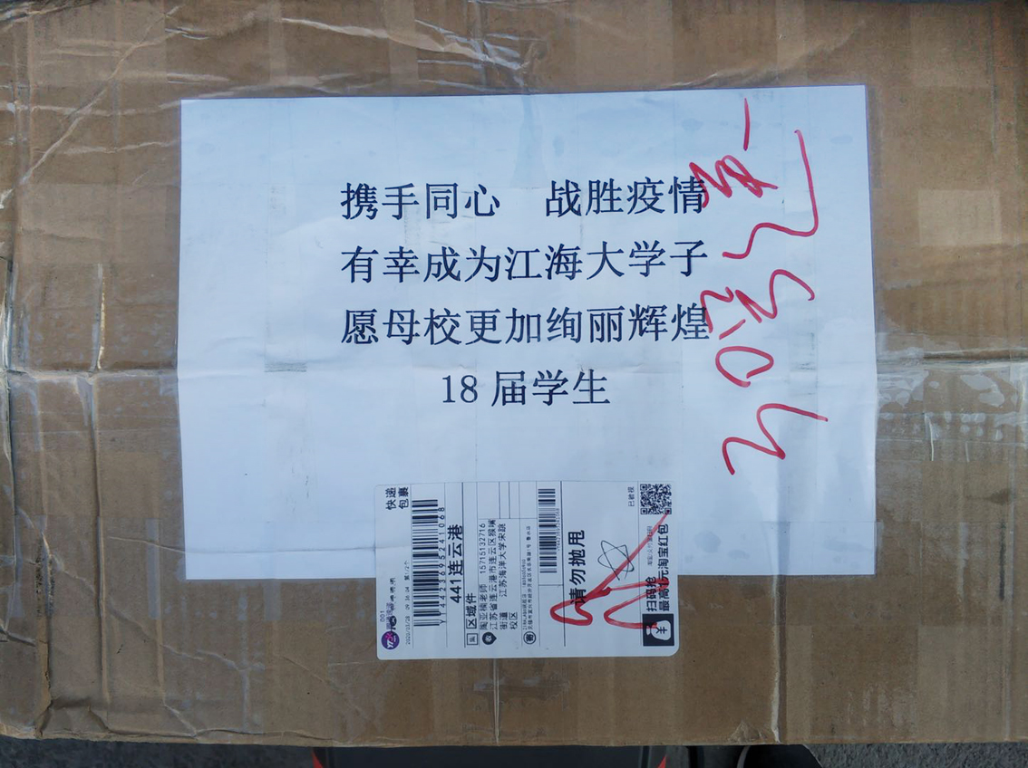 携手同心,战胜疫情;有幸成为江海大学子,愿母校更加绚丽辉煌——18届学生”。3月30号下午,学院收到了一箱来自远方的消毒液。据悉,该消毒液为我院G电气181班的高帆同学购买并邮寄至学院,用于学院的校园疫情防控工作。
