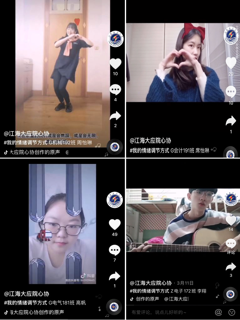 此次比赛面向全院,以“调适心理,携手抗疫”为主题,鼓励学生发掘生活中的正能量,创造出优秀作品,调节疫情在家的低落、疲惫情绪,展现学生的原创力、洞察力和价值观。比赛要求每位参赛成员拍摄1分钟左右的短视频并上传至学院心协官方抖音号,根据视频点赞数高低和评委的审核,评选出优秀作品。本次参赛选手的视频内容各具特色,富有创意,有通过唱歌、跳舞缓解情绪,有和朋友互动讲段子等等,同学们通过简短的视频展现出自己的风采,不但缓解了自己的低落情绪,也让同学们了解到更多的情绪调节方式。