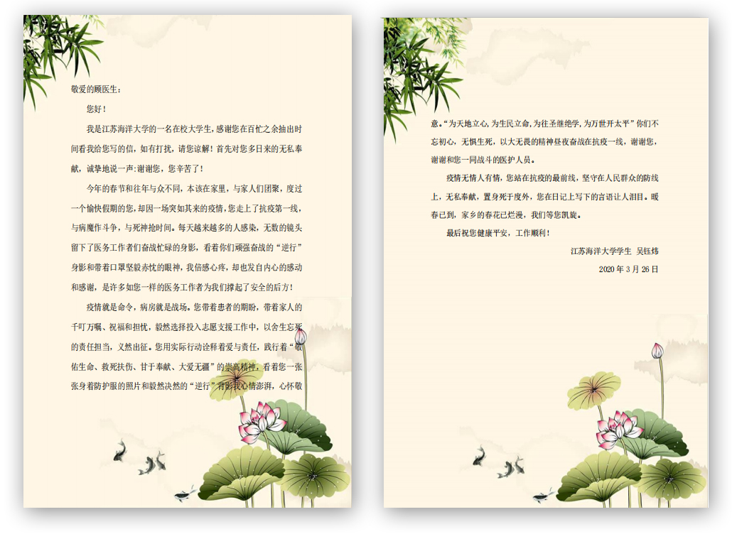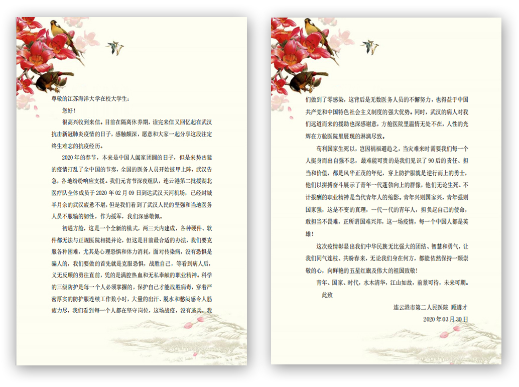 “读完来信又回忆起在武汉抗击新冠肺炎疫情的日子,感触颇深,愿意和大家一起分享这段注定终生难忘的抗疫经历。”近日,我院团委学生骨干吴钰炜同学收到支援武汉战“疫”医生顾遵才回信,并在团学青年中引起热议。