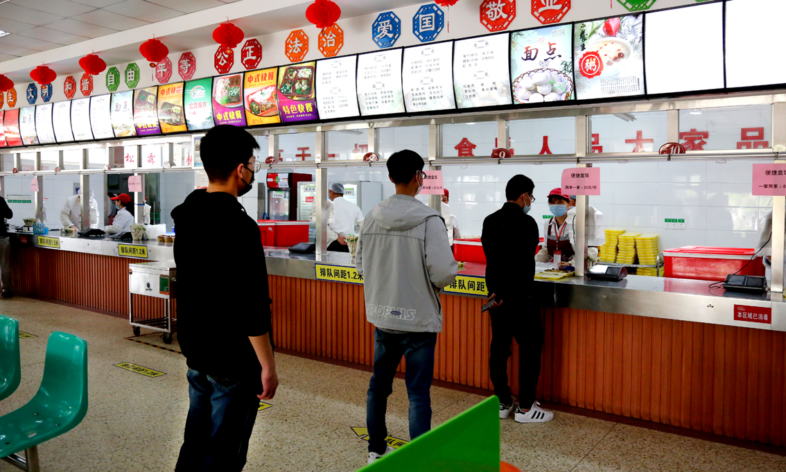 学校餐厅实行错时、分批次、分区域就餐,同学们按照工作人员指引,快速取餐,分隔而坐避免人员聚集。