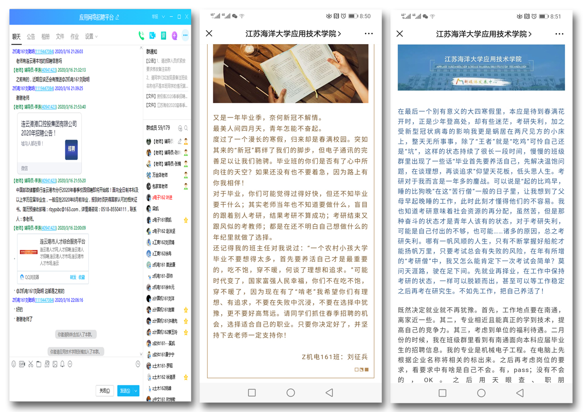 结合学生的求职意向需求,学院及时搭建“应用网络招聘平台”,及时推介、发布就业信息,及时解答学生疑问、解决学生诉求,邀请网信学院及有关用人单位开展线上求职培训与网络宣讲。学院微信公众号及时推送疫情期间求职成功学生案例,通过个人心得体会与班主任点评为待就业同学传经送宝。