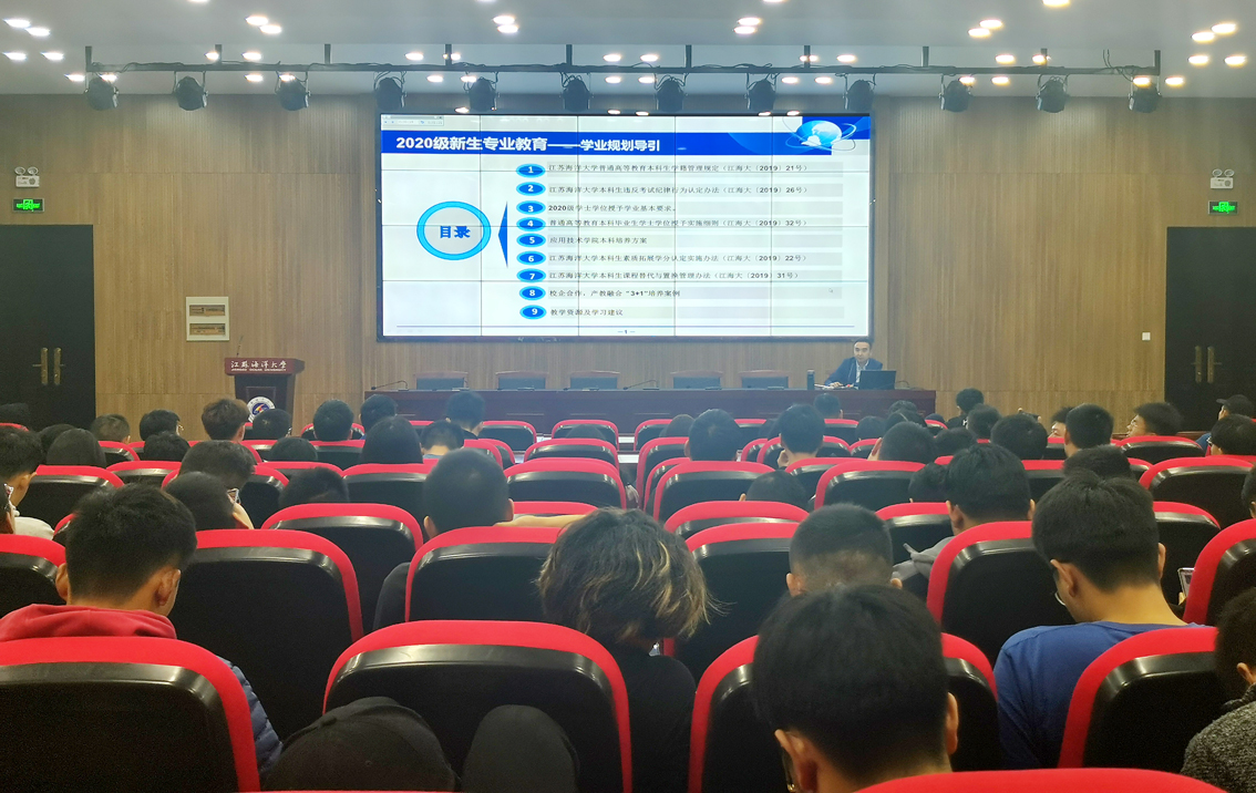 隋福利从江苏海洋大学普通高等教育本科生学籍管理规定着手,对重要的教学管理规章制度进行了详细的解读,对应用技术学院技术技能型人才培养目标及人才培养方案设计理念和实施路径进行了阐述,以2020年暑期学生在四季沐歌集团和镇江软通公司两个企业的综合实训为案例,并分享了由实训学生自录、自编、自制的在四季沐歌集团实习视频短片,对校企合作、产教融合“3+1”人才培养模式进行了详实的介绍。接着,隋福利向学生介绍了学校的各类数字学习资源、正方教务管理系统和其他应用系统使用方法,以及应用技术学院创智苑作为学生创新创业孵化基地的基本架构情况,在介绍藏修楼自主学习空间建设思路时,特别强调了学院为满足学生考研学习需求,暑期对图书馆206自修室进行了电源改造,为每一给考研的学生提供考研专属的固定学习座位。最后,隋福利针对学生学业提出了几点要求,要养成自主学习的习惯,树立学习的信心,规划好人生的目标,掌握正确的学习方法,具有坚强的学习毅力,吃苦耐劳的良好品德,抗拒挫折的勇气,尽快融入集体生活,快乐度过大学生活。