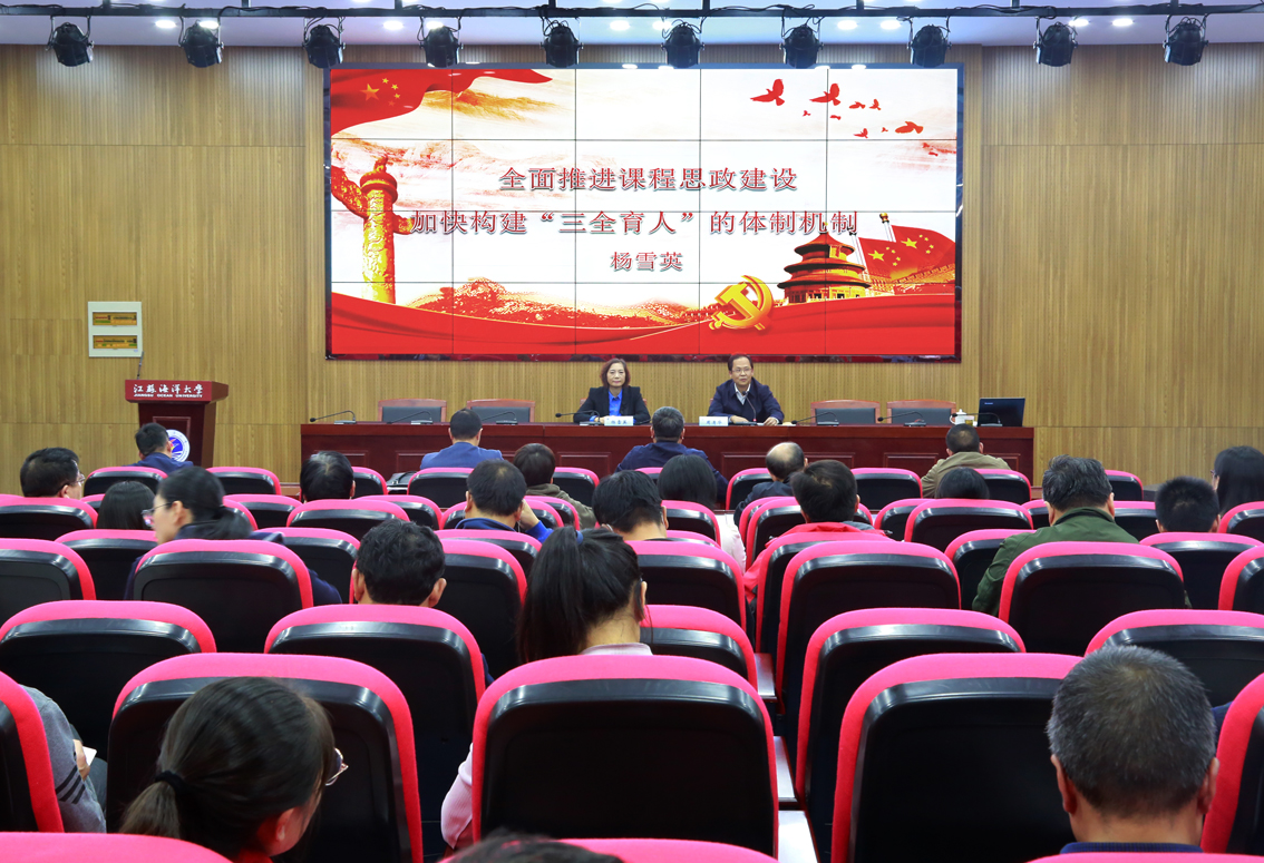 10月21日下午,校党委常委、宣传部部长杨雪英教授来我院作《全面推进课程思政建设,加快构建“三全育人“的体制机制》专题报告。学院全体教职工参加学习。院党委书记周清华主持会议。