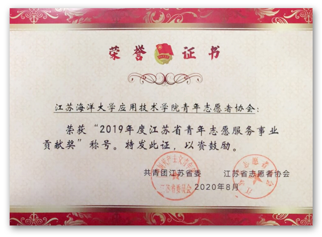 近日,共青团江苏省委和江苏省志愿者协会联合发文,对2019年度江苏省志愿者行动评选进行表彰,我院青年志愿者协会因长期坚持弘扬“奉献、友爱、互助、进步”的志愿服务精神,并在无偿献血、社区服务、助残筑梦、敬老助老等志愿服务领域中不忘初心,以志愿青春建功新时代,荣获2019年度江苏省青年志愿服务事业贡献奖。