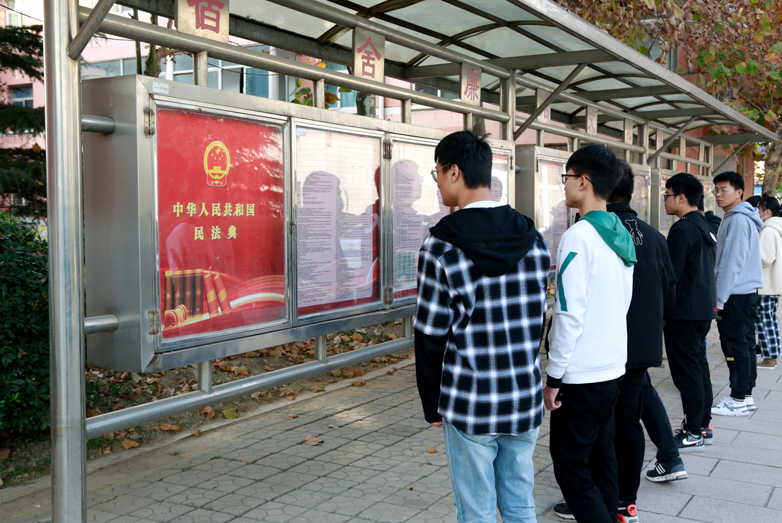 此次活动通过设置宣传版面方式进行宣传,共印制了6块展板,从总则、物权、合同、人格权、婚姻家庭、继承、侵权责任、附则等八项内容,向广大师生宣传《民法典》具体内容,让《民法典》走到群众身边,通过展板宣传,大家纷纷表示《民法典》与日常生活息息相关,事关每个公民的切身利益,是保护个人权益的法律汇总,在今后的工作和学习中,要不断加深对《民法典》的理解认识和学习宣传,自觉增强法律意识和法治观念,不断提高自身法律素质,依法履行职能,争做学习、遵守、维护《民法典》的表率。