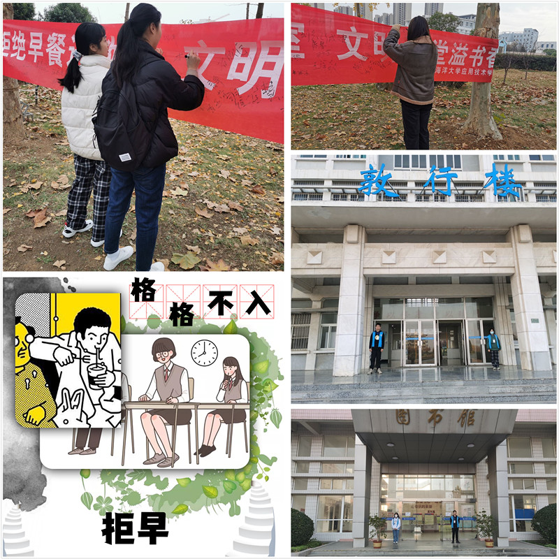 文明督导我先行。学院学生会拒早志愿者穿蓝色马甲,手举指示牌。他们负责提醒同学们吃完早餐再进入教学楼,并向不配合的同学讲述拒绝早餐进教室的意义以及养成良好的行为习惯的重要性。学生会希望通过此次活动维护教室环境,为同学们营造文明、卫生、整洁的学习环境。