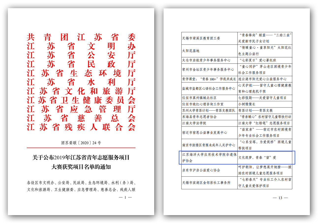 近日,由团省委、省文明办、公安厅、民政厅、生态环境厅、水利厅、文旅厅、卫健委、应急管理厅、省慈善总会和省残联共同举办的2019年江苏省青年志愿服务项目大赛公布获奖名单。我院非遗保护协会“文化筑梦,青春‘留’爱”项目获得关爱留守儿童类项目三等奖,成为全校唯一在该项赛事中获奖的项目。