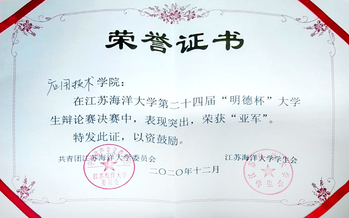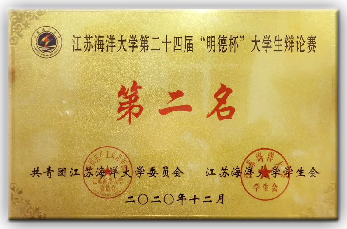 最终我院获得校第二十四届“明德杯”大学生辩论赛第二名,我院辩论队陈袁媛同学夺得最佳辩手奖3次,最具风采奖1次。