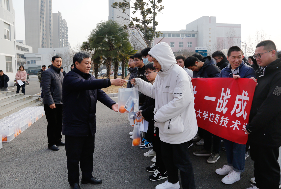 丁兆奎叮嘱考研学子们坚定信念、端正心态、劳逸结合,提醒大家要注意天气变化,以最佳的精神状态迎接考试的到来。他与万金店一起将装有赣南脐橙和祝福卡片寓意“橙”功上岸、心想事“橙”的考研加油包送到考研学子手中,祝福大家执笔为剑、披荆斩棘、“脐”开得胜、一战“橙”硕。
