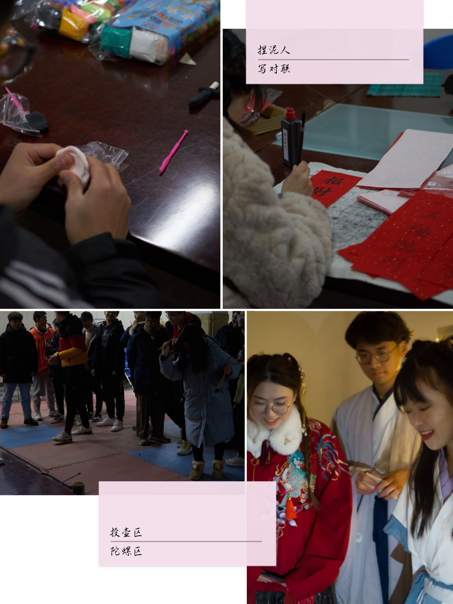 游园分为写冬至、展冬至、说冬至、乐冬至、品冬至、赏冬至环节,精彩纷呈。第一站写冬至,书法爱好者们齐聚一堂,书写冬至祝福。第二站展冬至,社联走廊设置灯谜区、祈愿区、剪纸区,同学们悬挂灯笼、剪纸、心愿小纸条,祈福国泰民安,考试过关。第三站说冬至,活动设置冬至诗词、冬至灯谜、冬至成语接龙环节。其中最吸引人的是乐冬至环节,打陀螺、猜拳、蹴鞠、投壶、捏彩泥,同学们其乐融融。当然也少不了冬至包饺子、吃饺子的品冬至环节。