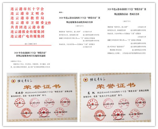 近日,由市红十字会、市文明办、市教育局、市卫健委、团市委、连云港报业传媒集团、连云港广电传媒集团等联合表彰的连云港市“博爱青春” 暑期志愿服务项目,我院热血抗疫,为生命护航----无偿献血“三进”志愿服务,被评为全市仅有的4项高校红十字会“博爱青春”暑期志愿服务活动优秀项目,并被评定为2020年连云港市高校红十字会“博爱青春”暑期志愿服务活动一类项目。