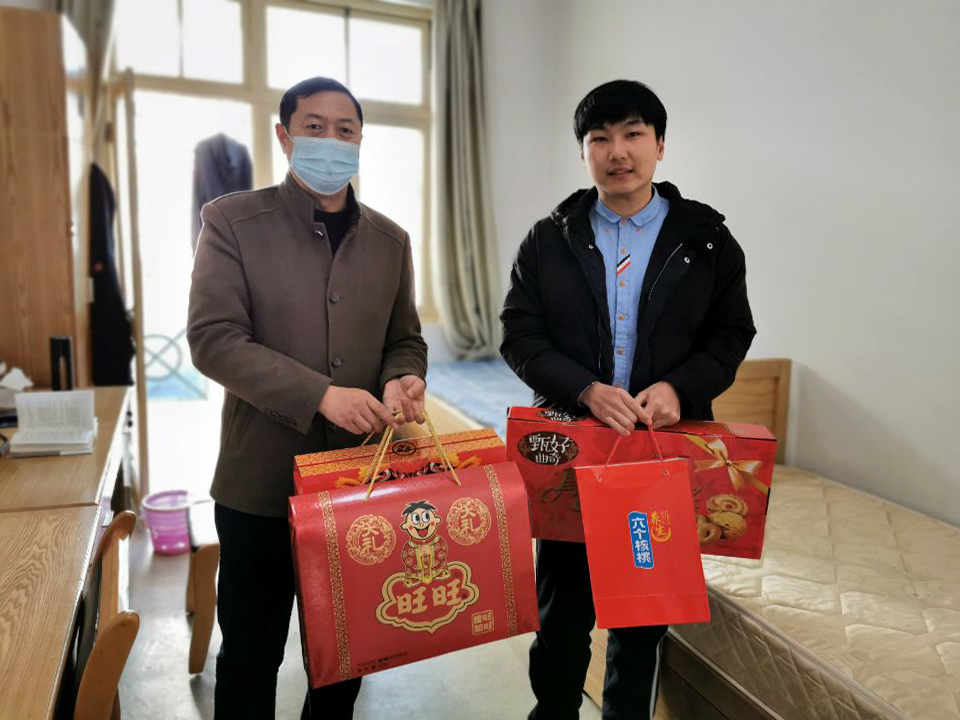 新春将至,岁寒情深。2月8日上午,院党委副书记万金店与辅导员一行走访苍梧校区B2学生宿舍楼看望慰问因疫情留校的石家庄籍学生Z软件202班梁浩同学。
