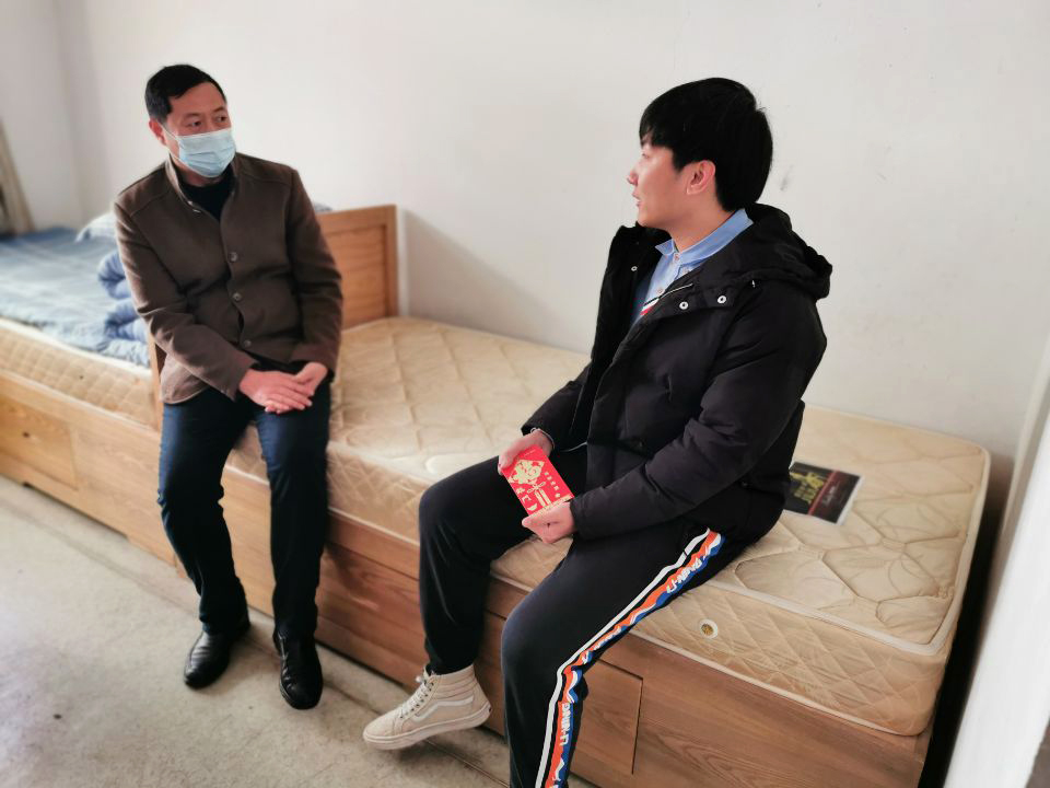 万金店代表学院为梁浩同学送上压岁红包和春节大礼包,对梁浩表示亲切慰问,并向其家人表达了新春祝福。他详细了解了梁浩的生活和学习情况,以拉家常的形式询问梁浩家乡疫情防控情况与过年习俗,并主动邀请梁浩同学大年三十到家中包饺子、吃饺子。他同时鼓励梁浩增强打赢疫情防控阻击战的信心,合理安排学习和休息时间,加强体育锻炼,并再三叮嘱梁浩在学校这个温暖的大家庭中,无论在学习、生活还是其它任何方面有困难、有要求,都可以及时与学院反映。